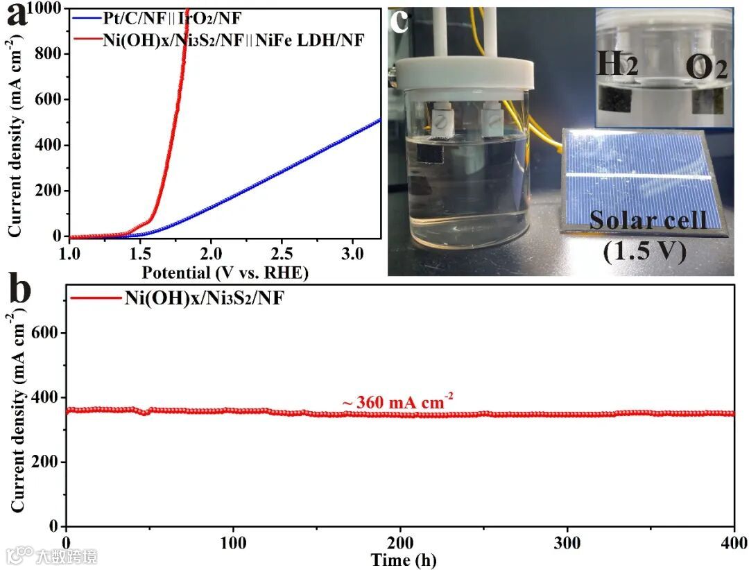 图5. (a) Ni(OH)x/Ni3S2/NF/NF‖NiFe LDH/NF和Pt/C/NF‖IrO2/NF电极对在1 M KOH中全水解的LSV曲线;(b) Ni(OH)x/Ni3S2/NF‖NiFe LDH/NF在~360 mA cm-2下记录400 h的计时电位曲线; (c)在1 M KOH中太阳能电池驱动的Ni(OH)x/Ni3S2/NF‖NiFe LDH/NF电解槽装置的照片。