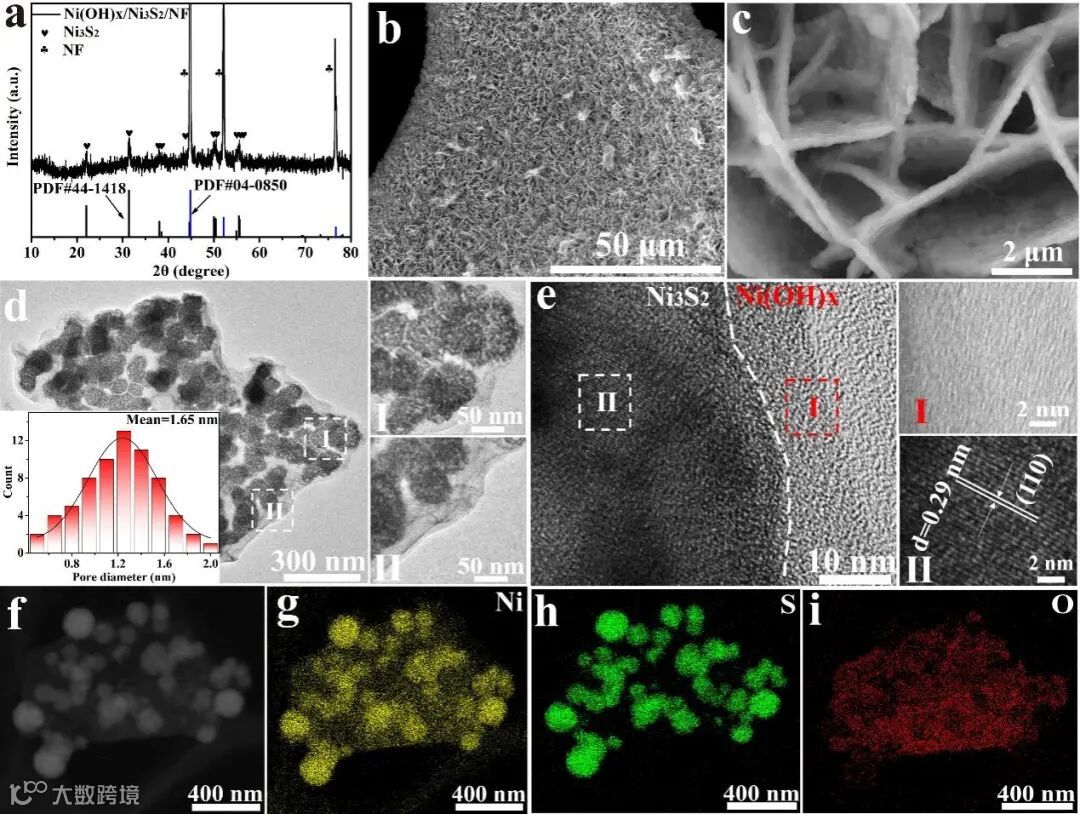 图1. (a) Ni(OH)x/Ni3S2/NF的XRD图;Ni(OH)x/Ni3S2/NF的(b-c) SEM、(d) TEM、(e) HRTEM图像和(f-i) EDS元素映射。