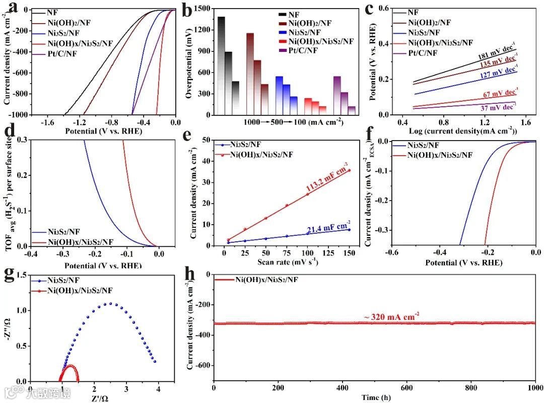 图 3. NF、Ni(OH)2/NF、Ni3S2/NF、Ni(OH)x/Ni3S2/NF和Pt/C/NF的(a) LSV曲线、(b) 100、500和1000 mA cm-2下过电位的比较和(c) Tafel曲线;Ni3S2/NF和Ni(OH)x/Ni3S2/NF的(d) TOF、(e) Cdl、(f) 归一化到ECSA的LSV曲线和(g) EIS;(h) Ni(OH)x/Ni3S2/NF在~320 mA cm-2下记录的1000 h计时电位曲线。