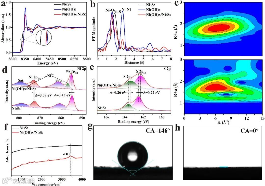图2. Ni3S2、Ni(OH)2和Ni(OH)x/Ni3S2的Ni K边缘的(a) XANES光谱和(b) EXAFS的FT光谱; (c) Ni3S2和Ni(OH)x/Ni3S2的小波变换结果; Ni3S2和Ni(OH)x/Ni3S2的(d) Ni2p、(e) S2p的XPS光谱和(f) FT-IR光谱; (g) Ni3S2和(h) Ni(OH)x/Ni3S2的接触角。