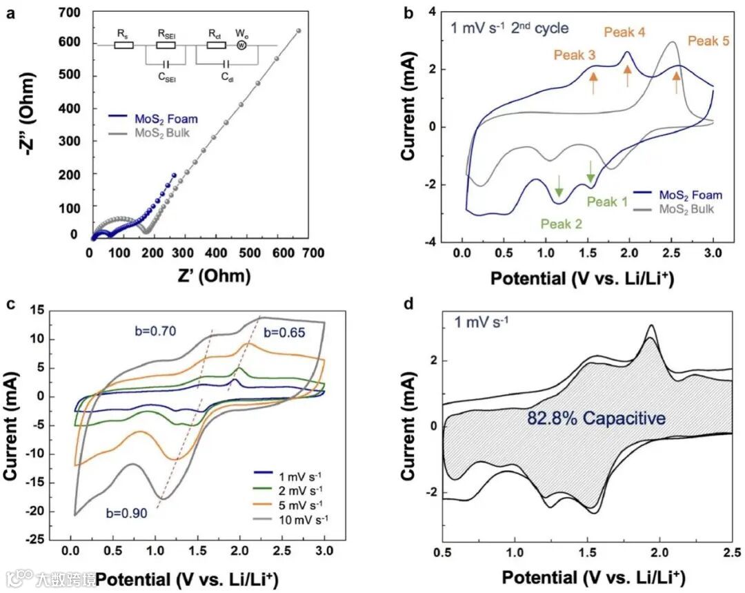 【图4】赝电容电荷存储有助于MoS2泡沫展现出色的倍率容量。(a)在100m A g-1下十次循环后完全放电状态下的MoS2泡沫和MoS2体电极的Nyquist图。(b)CV测量的特点是在0.01-3V的电压窗口中,在1mVs-1下,MoS2泡沫和MoS2体电极的第2次循环。(c)电容效应的特征是基于i=avb分析不同扫速下的CV曲线,其中测得的电流i与扫速v呈幂律关系。(d)在锂离子电解质中以1 mV s-1的扫速循环的架构化MoS2的电容性和扩散控制的电荷存储贡献。