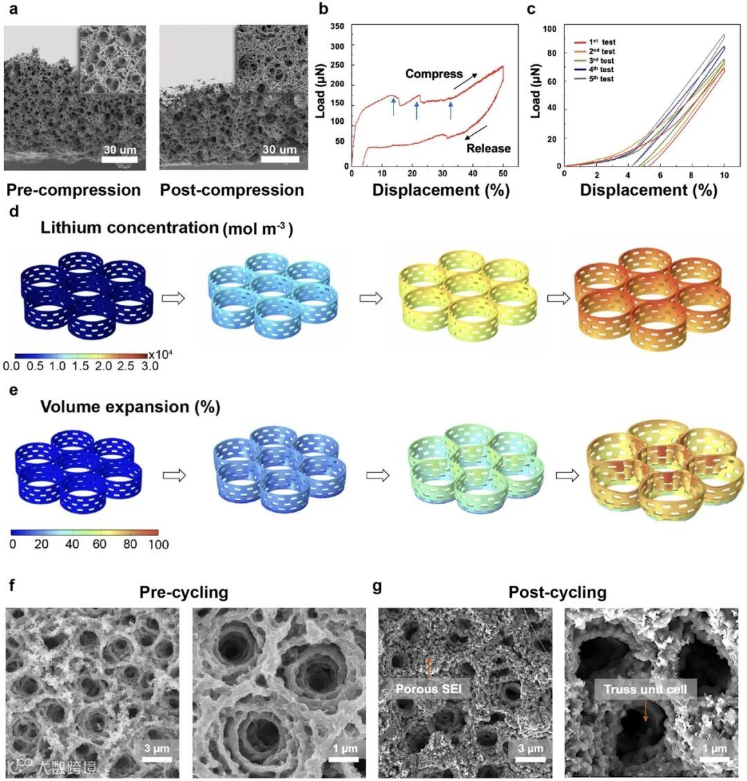 【图3】MoS2泡沫的结构稳定性。(a)将MoS2泡沫压缩至50%的压缩前后对比的SEM图像显示出优异的结构可恢复性。(b)载荷和压缩率曲线(压缩至50%)显示具有连续锯齿状(灰色箭头)的韧性特征,证明了多层级结构的多步形变。(c)载荷和压缩曲线(位移至10%)表现出具有良好恢复性和弹性特征。(d)不同充电状态(SOC)下MoS2内的锂离子扩散和相关浓度分布。SOC=100%时的最高比例尺浓度是根据原始MoS2的理论容量计算得出的。(e)不同SOC下的体积膨胀。SOC=100%时约为70%。(f)原始MoS2泡沫和(g)MoS2泡沫在1000次充电/放电循环后的SEM图像证明SEI层的均匀形成而分层结构保持不变。