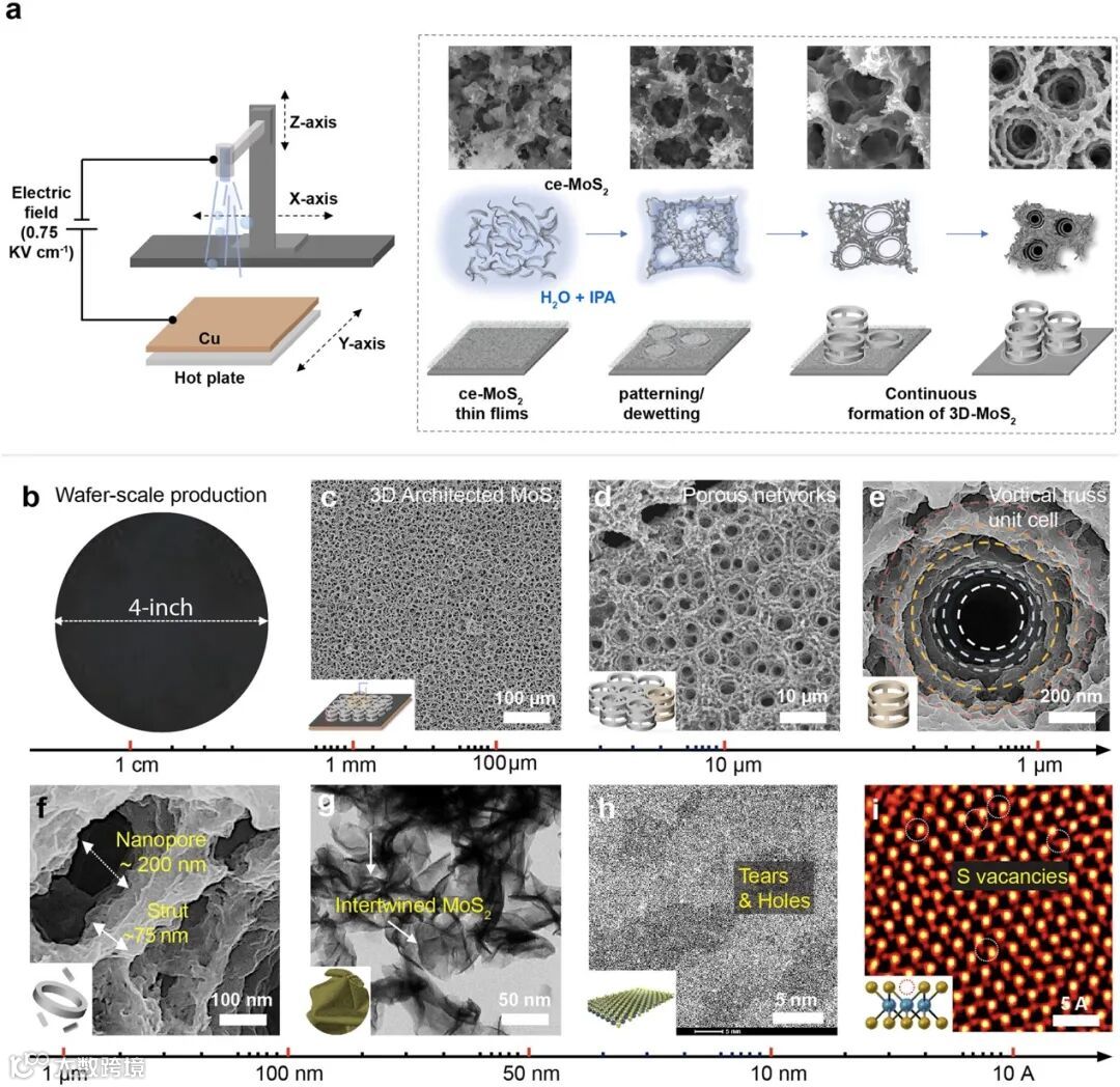 【图1】通过静电喷涂实现蒸发诱导自组装的3D MoS2泡沫。(a)静电喷涂装置示意图和MoS2泡沫的结构演变过程。(b)在4英寸铜集流体基底上均匀分布的MoS2泡沫,包括超过七个数量级的结构层次:(c)三维泡沫结构,(d)互连多孔网络,(e)旋涡状桁架单元,(f)纳米孔和支柱,(g)交织在一起的MoS2纳米片,(h)纳米片基面上的裂纹和孔,和(i)S空缺。