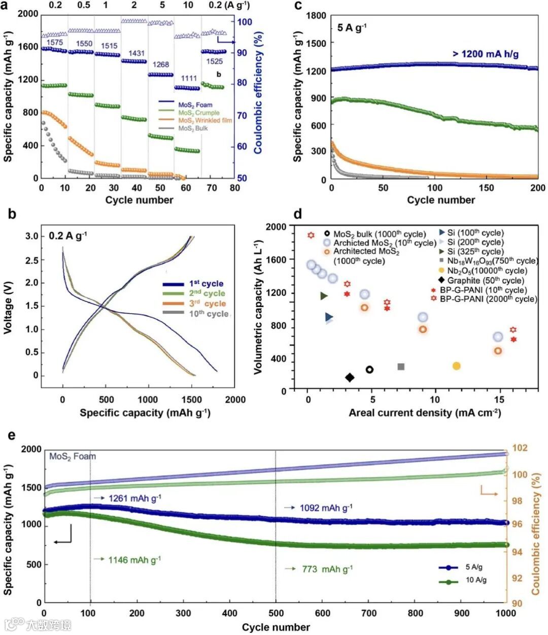 【图2】MoS2泡沫的电化学性能与其他形貌MoS2性能的对比。(a)在不同的电流密度下测量的倍率容量性能。(b)前10个循环中MoS2泡沫的恒电流放电和充电曲线。(c)在5 A g-1电流密度下的循环稳定性比较。(d)MoS2泡沫与各种最先进的负极相比,体积容量仍具有优势。(e)5 A g-1和(d)10 A g-1的电流密度下测量的MoS2泡沫负极的100圈循环性能。