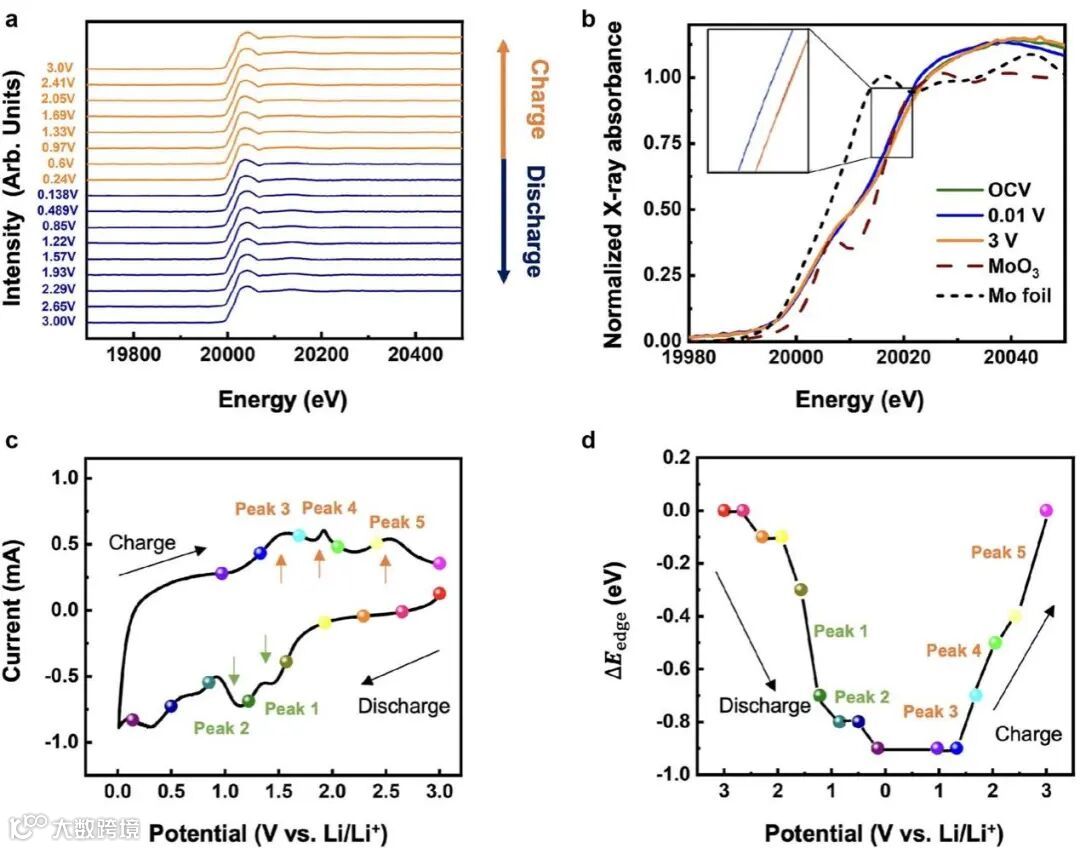 【图5】MoS2泡沫中Mo氧化还原反应的原位XANES分析。(a)在不同电位下测量的归一化原位Mo K边缘XANES光谱(蓝色:放电过程;红色:充电过程)。(b)MoS2泡沫在开路电压(OCV,2.86 V)、第1圈放电完(0.01 V)和第1圈充电(3 V)下的归一化原位Mo K边XANES,与参照组MoO3和钼金属的对比。(c)MoS2泡沫负极在0.3 mV s-1扫速下的CV图和(d)不同电位下的相应吸收边能量偏移(ΔEedge)的对应(在循环伏安图中标记为彩色点)。
