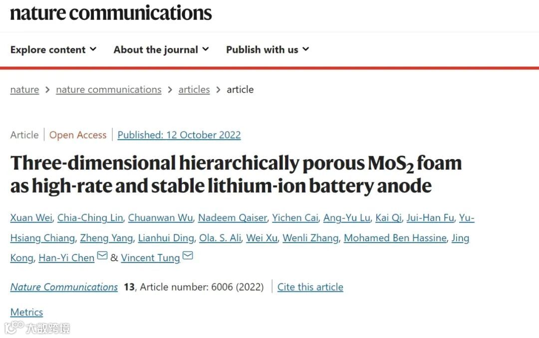 这项工作为通过建立多层级结构引入特殊性质,实现特殊功能的各种应用开辟了广阔的前景。研究以题目为“Three-dimensional hierarchically porous MoS2 foam as high-rate and stable lithium-ion battery anode”的论文发表在顶级期刊《Nature Communications》。第一作者为来自沙特阿拉伯阿卜杜拉国王科技大学的魏璇博士。