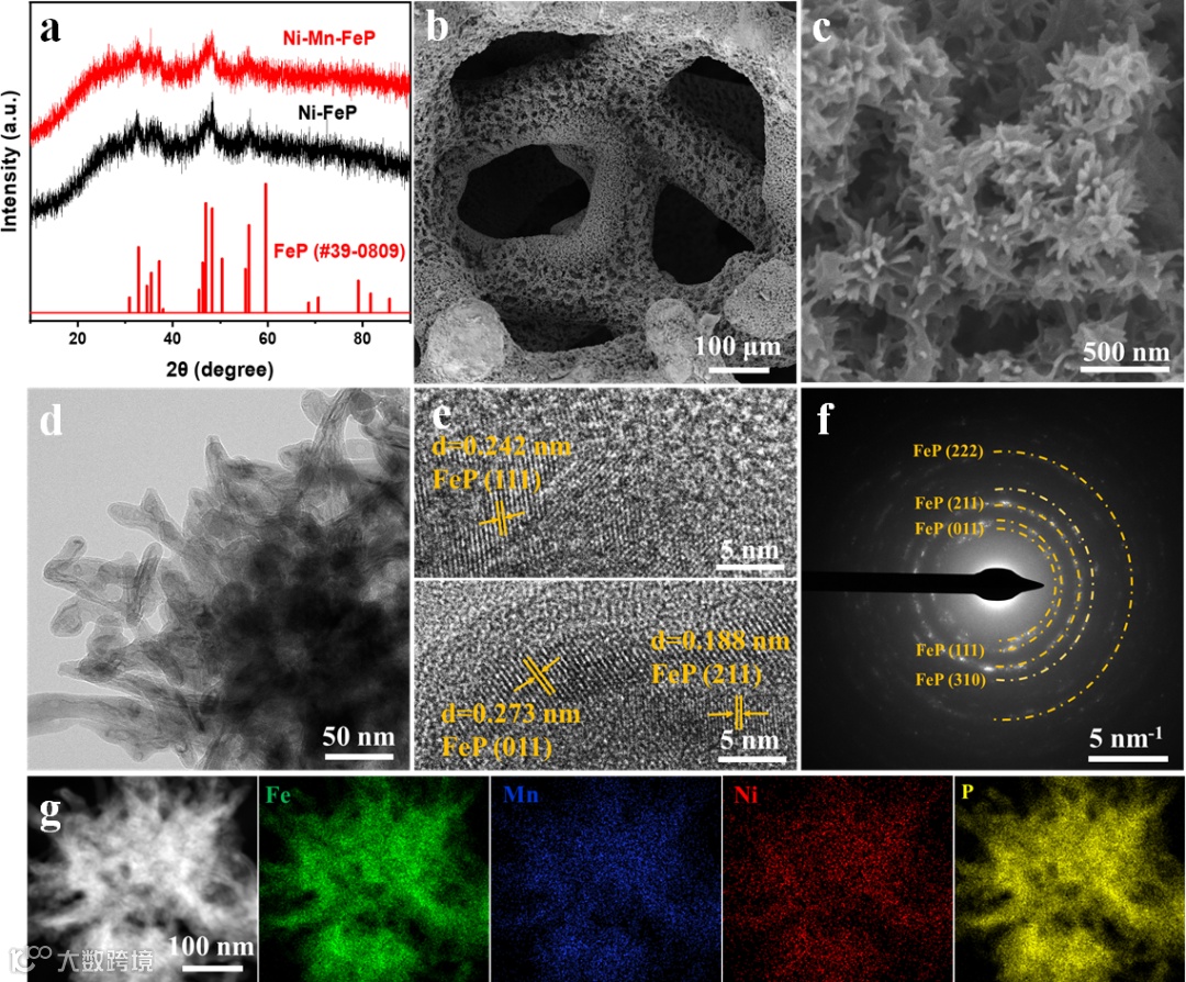 图2. (a) Ni-Mn-FeP 和Ni-FeP XRD衍射谱图。Ni-Mn-FeP 的SEM图像(b, c)、TEM(d)、HRTEM图像(e)以及SAED衍射谱图(f)。Ni-Mn-FeP 中Fe、Mn、Ni和P的元素分布(g)。