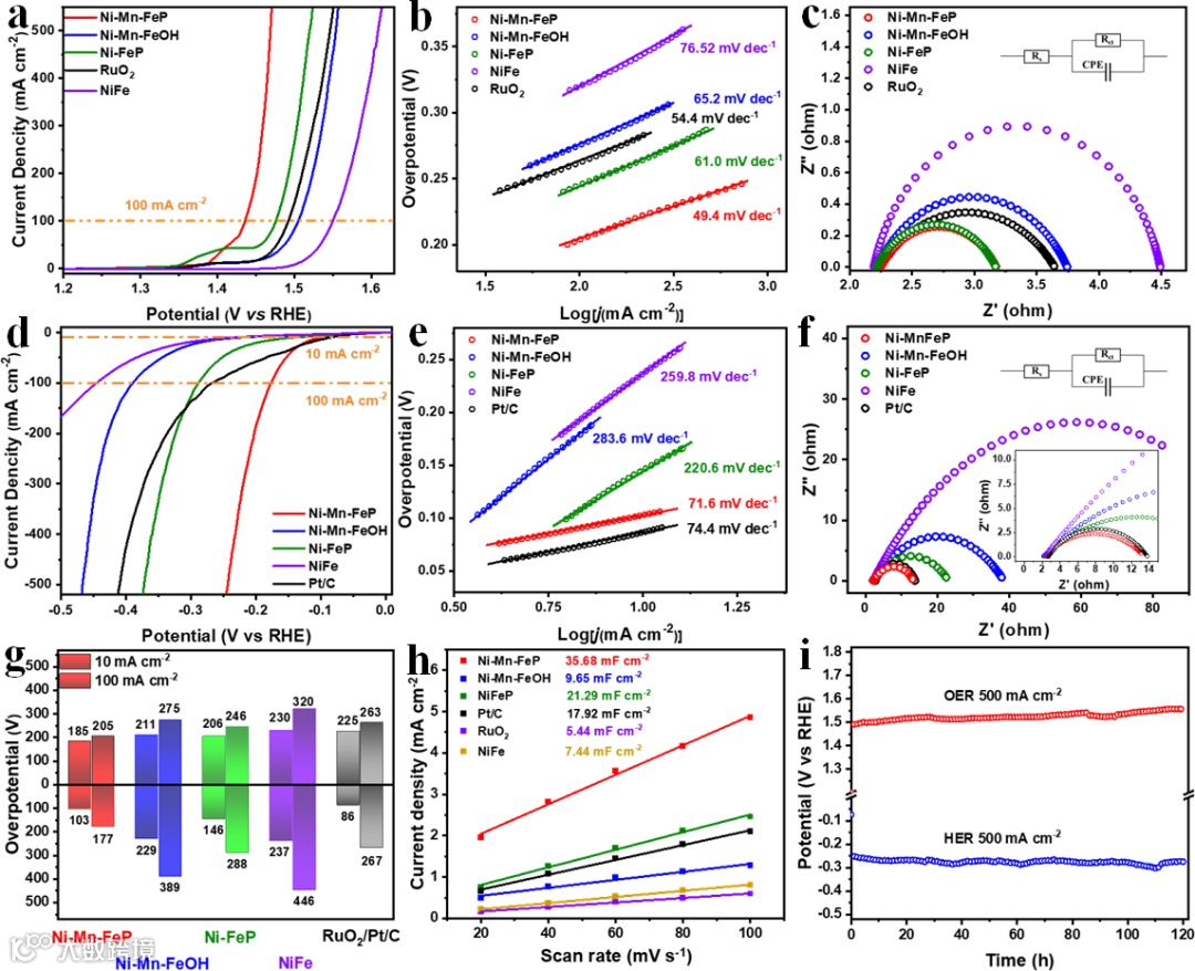 图4. Ni-Mn-FeP及对比样品在1M KOH中的OER性能:线性扫描曲线(a),塔菲尔曲线(b)以及奈奎斯特曲线(c)。Ni-Mn-FeP及对比样品在1M KOH中的HER性能:线性扫描曲线(d),Tafel曲线(e)以及Nyquist曲线(f)。Ni-Mn-FeP及对比样品在10及100 mA cm-2 的OER和HER过电位对比(g)。Ni-Mn-FeP及对比样品的Cdl(h)。Ni-Mn-FeP在500 mA cm-2电流密度下的OER和HER稳定性。