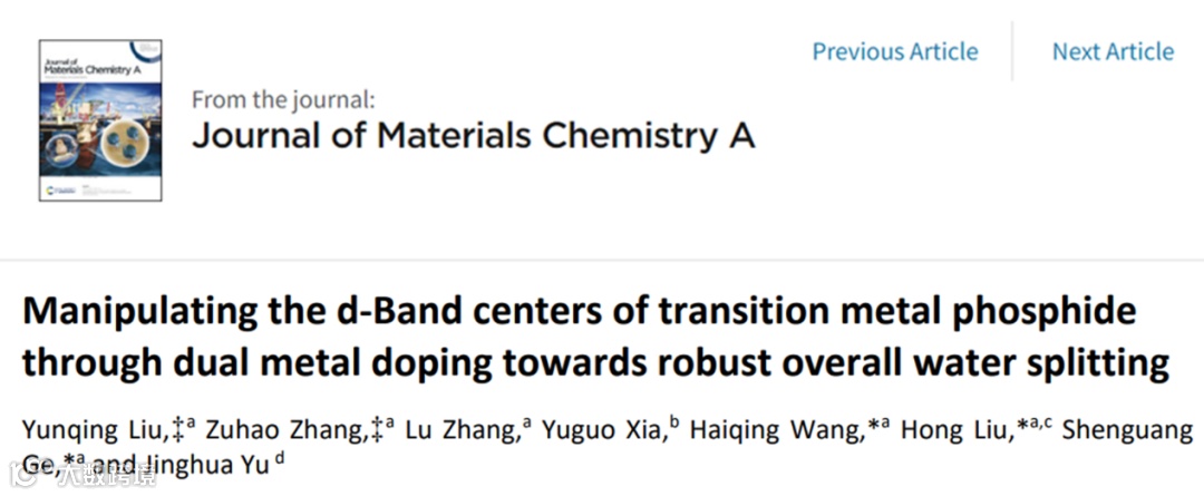 基于此,来自济南大学的王海青副教授、葛慎光教授与山东大学的刘宏教授合作,在国际知名期刊Journal of Materials Chemistry A上发表题为“Manipulating the d-Band centers of transition metal phosphide through dual metal doping towards robust overall water splitting”的研究文章。
