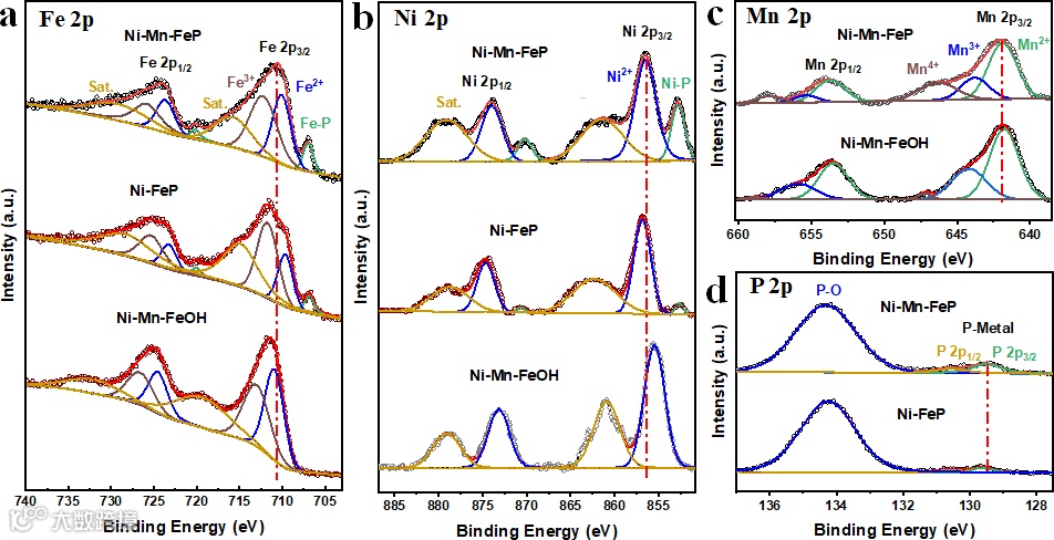 图3. Ni-Mn-FeP、Ni-FeP以及Ni-Mn-FeOH中High-resolution XPS spectra. Fe 2p(a)、Ni 2p(b)的高分辨XPS谱图。Ni-Mn-FeP和Ni-Mn-FeOH 中Mn 2p的高分辨XPS谱图(c)。Ni-Mn-FeP及Ni-FeP中P 2p的高分辨XPS谱图。