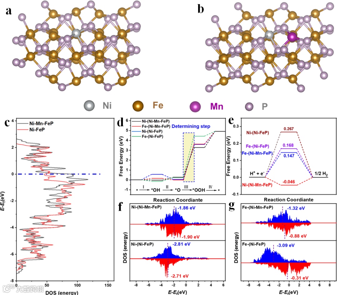 图5. Ni-FeP(a)和Ni-Mn-FeP(b)的模拟计算模型。(c)Ni-Mn-FeP和Ni-FeP的总态密度(TDOS)。(d)Ni-Mn-FeP和Ni-FeP中Fe、Ni位点上OER的四个步骤的吉布斯自由能。(e)氢在Ni-Mn-FeP和Ni-FeP的Fe、Ni位点上吸附的吉布斯自由能。(f)Ni-Mn-FeP和Ni-FeP的Ni的上旋和下旋分态密度(PDOS)。(g)Ni-Mn-FeP和Ni-FeP的Fe的上旋和下旋分态密度(PDOS)。