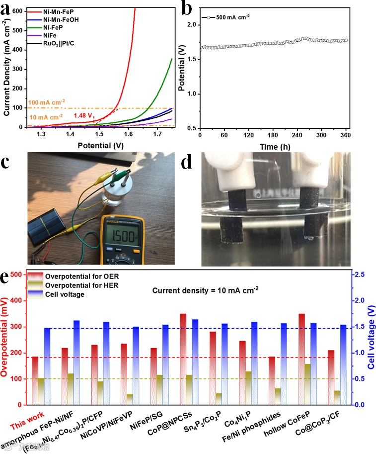 图6. (a)Ni-Mn-FeP及对比样品的 全解水极化曲线。(b)Ni-Mn-FeP在500 mA cm-2电流密度下全解水稳定性。(c)由太阳能电池驱动的双电极体系全解水。(d)全解水工作状态下的双电极体系。(e)Ni-Mn-FeP与近期报道的过渡金属磷化物催化剂的性能对比。