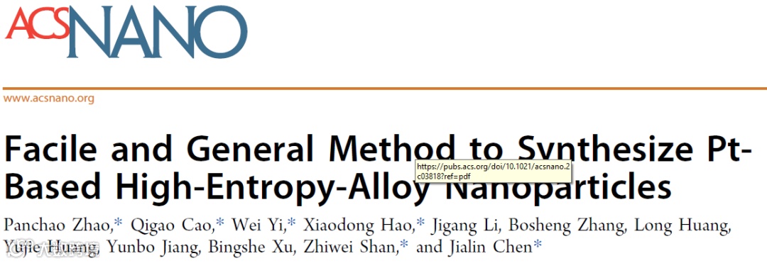 Panchao Zhao*, et al. Facile and General Method to Synthesize Pt-Based High-Entropy-Alloy Nanoparticles. ACS Nano, 2022. 10.1021/acsnano.2c03818.