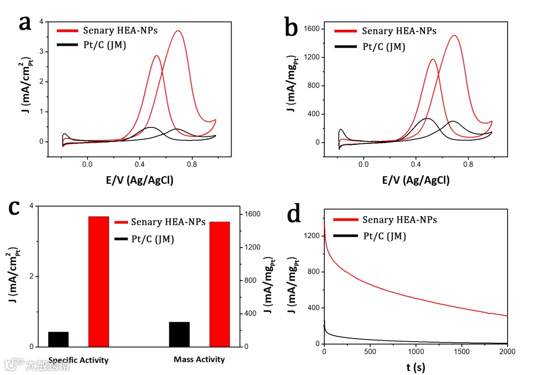 为了证明制备材料的有用性,对PtCoCuRuNiFe HEA-NPs进行了催化氧化甲醇实验,实验表明PtCoCuRuNiFe HEA-NPs表现出了优异的催化氧化甲醇性能,质量电流强度是商用碳载铂的5倍,耐久性也优于商用催化剂。
