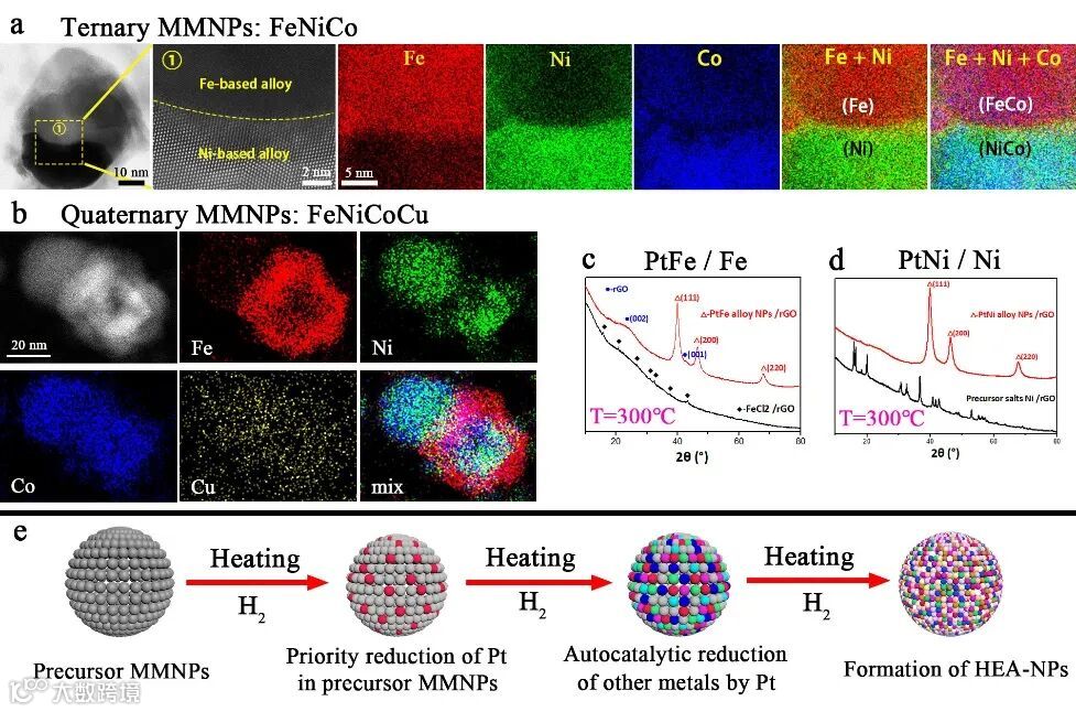 通过对铂基合金和不含铂体系合金(FeNiCo/FeNiCoCu)纳米材料研究,发现铂原子在高熵合金纳米粒子形成过程中起到关键作用,对铂基多元合金和非铂体系合金在低温下还原分解,发现含铂体系均可在低温条件下(300℃)形成单项固溶体结构,而非铂体系在300℃时还未分解完全且出现了物相的分离,揭示了体系中铂元素可有效的催化降低其他金属的还原温度,使不同元素在低温条件下可同时被还原形成单相固溶体结构。