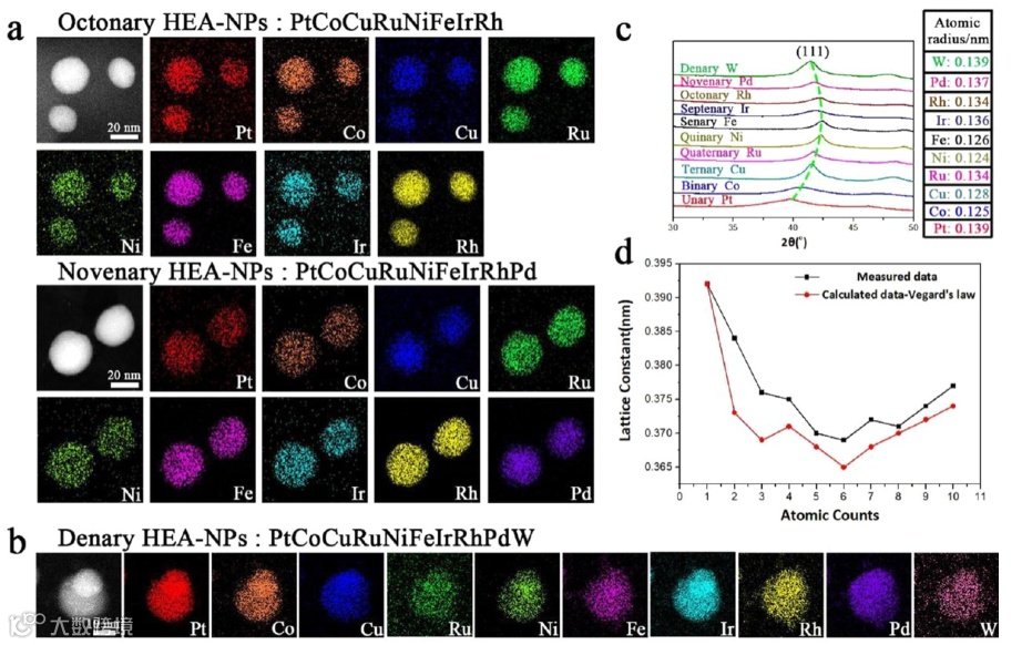 今年来,由五种或五种以上元素以等摩尔比或近摩尔比组成的高熵合金纳米粒子(High-entropy-alloy nanoparticles, HEA-NPs)作为一种全新设计理念材料,由于组份的多样性、表面原子结构的复杂性、高混合熵和纳米尺度效应,有望实现高活性、高选择性、高稳定性和长使用寿命的新型多元催化剂,备受广大科研人员关注。