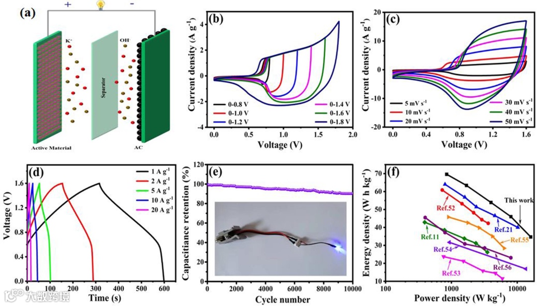 NiCo2S4@HCs电极显示出超高的比电容(3178.2 F/g在1 A/g),显著的倍率能力2179.3 F/g (30 A/g)以及突出的循环稳定性(5000循环后电容保留率为95.9%),构建的不对称超级电容器NiCo2S4@HCs//AC器件在功率密度为847 W/kg时有69.6 W h/kg的高能量密度,10000次充放电循环后电容保持在90.2%,具有很好的商业应用价值。