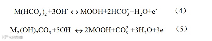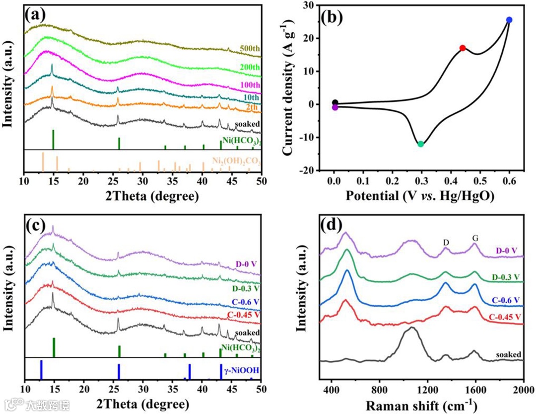 目前,NiCo(HCO3)2的储能机理尚不清楚,该工作通过对NiCo(HCO3)2的充放电过程进行了XRD与Raman的分析,结果证明了NiCo(HCO3)2先在充电过程中转化成γ-NiCoOOH和HCO3-,然后在放电过程中又会部分转变回NiCo(HCO3)2。此外,由于HCO3-在碱性电解液中不稳定会转化成CO32-,所以在循环100圈以后NiCo(HCO3)2会完全转化成(Ni,Co)2(OH)2CO3。材料的储能机理如下所示(用M2+代替Ni2+/Co2+来简化方程式):