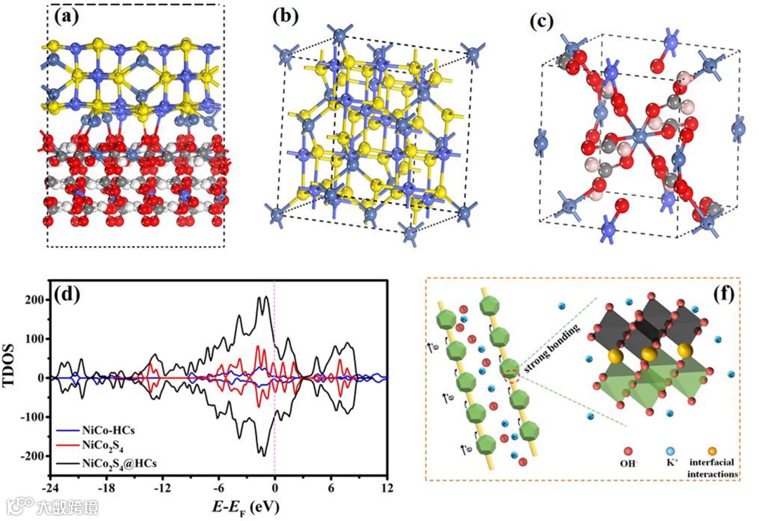 该研究开发了一种简单的方法,成功构建了一种糖葫芦状的NiCo2S4@HCs核壳异质结构。这种合理的设计使NiCo2S4与NiCo(HCO3)2之间产生了强烈的界面相互作用。DFT计算和XPS分析表明,这不仅有利于电子转移和离子吸附/解吸过程,而且大大增加了电活性位点,防止了电极材料的结构退化。