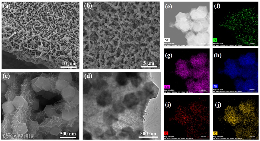 该工作采用交联的NiCo2S4纳米线将NiCo(HCO3)2多面体紧密串在一起,形成了类似糖葫芦状的NiCo2S4@HCs核壳异质结构,彼此又相互连接形成了三维交联网络结构。该结构不仅具有丰富的电化学活性位,适宜的扩散通道和良好的结构稳定性,而且由于两组分之间的强界面相互作用,在整个电极中表现出更高效的电子转移和离子扩散。