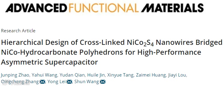 在本文中,来自温州大学的王舜教授/张青程副教授与德国伊尔梅瑙理工大学雷勇教授合作在国际权威期刊Advanced Functional Material上发表题为“Hierarchical Design of Cross-linked NiCo2S4 Nanowires Bridged NiCo-Hydrocarbonate Polyhedrons for High-Performance Asymmetric Supercapacitor”的研究论文。