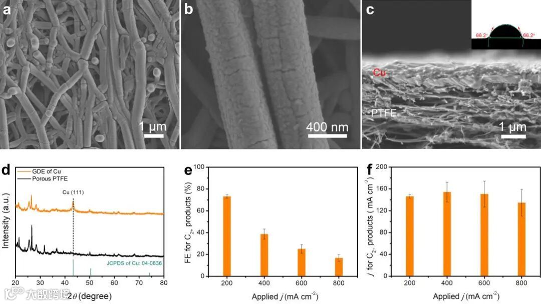 图2.(a)和(b)Cu气体扩散电极SEM图;(c)Cu气体扩散电极切片SEM图;(d)Cu气体扩散电极和多孔PTFE纤维XRD图谱;不同应用电流下C2+产物(e)法拉第效率和(f)偏电流密度。