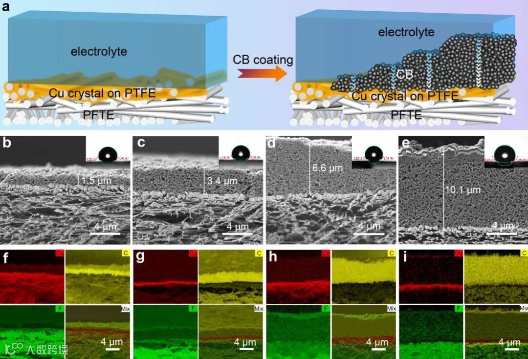 图4.(a)不同厚度CB传质层制备流程示意图;(b)Cu/C1.5,(c)Cu/C3.4,(d)Cu/C6.6以及(e)Cu/C10.1切片SEM图(b-e右上角为具有不同厚度CB传质层的Cu气体扩散电极接触角测试图);(f)Cu/C1.5,(g)Cu/C3.4,(h)Cu/C6.6以及(i)Cu/C10.1元素分布图。