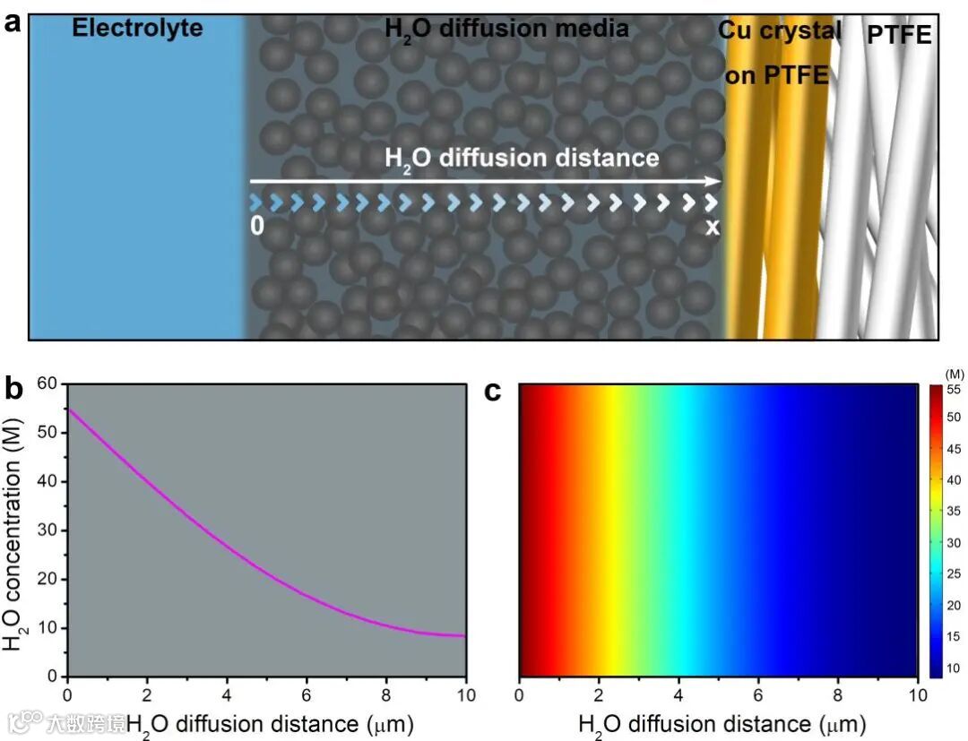 CO2电还原反应制备C2+产物涉及到碳氧吸附物种的深度氢化过程。根据半反应方程式,氢化程度越高的产物,需要更多的H2O参与反应。例如,制备1 mol CO,H2O与CO2摩尔比(H2O/CO2)为1.0,而制备1 mol C2H4和1 mol CH4,H2O/CO2则分别为4.0和6.0。因而调节催化界面局域H2O/CO2可以实现对产物分布的调控。有鉴于此,通过构造界面H2O传质层以增加H2O的传质距离,即可实现对催化界面局域H2O/CO2的调控作用,该过程通过传质模拟得到了印证(图3)。