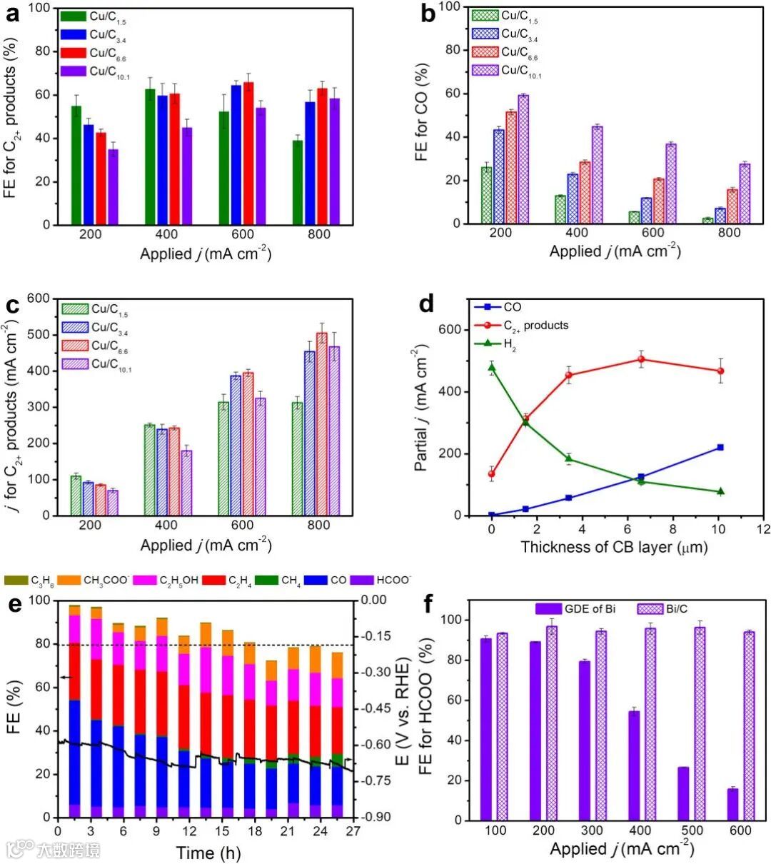 图5. Cu/C1.5,Cu/C3.4,Cu/C6.6以及Cu/C10.1的(a)C2+产物的法拉第效率,(b)CO废热法拉第效率以及(c)C2+产物的偏电流密度;(d)C2+产物偏电流密度与CB传质层厚度的关系;(e)Cu/C6.6的27小时恒电流稳定性测试;(f)不同应用电流下Bi和Bi/C制备HCOO-的法拉第效率。