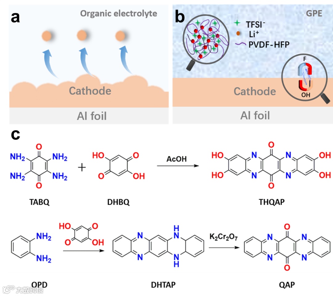 通过相关实验与理论计算分析发现,引入羟基官能团的THQAP醌类电极材料与GPE-0.8准固态电解质具有更好的界面兼容性,表现出更优异的电化学性能,这得益于THQAP与PVDF-HFP在电极/电解质界面产生了相互作用。该方法为研究准固态锂有机电池的设计和发展提供了一条新思路。THQAP和QAP电极材料的制备示意图如图1所示。