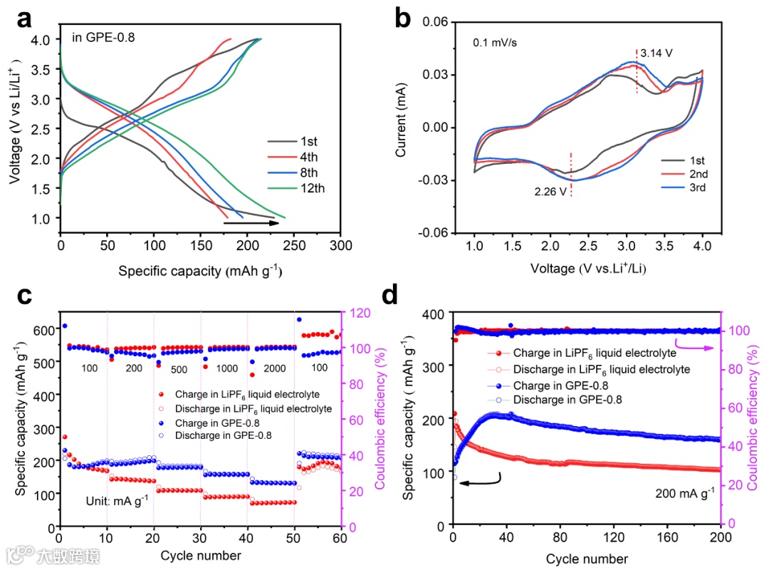 在GPE-0.8准固态电解质体系和1M LiPF6 EC/DMC/EMC液态电解液体系下,以THQAP为正极材料,锂为对电极组装成半电池进行了材料的电化学测试,研究了电化学性能与结构之间的关系。如图4的电化学性能测试结果所示,基于该GPE-0.8电解质的THQAP/Li固态电池展示出优异的电化学性能。在50 mA g−1的电流密度下THQAP正极材料体系中表现出240 mAh g−1的良好可逆容量,并且在电流密度为200 mA g−1条件下循环200次后容量保留率为78% (160 mAh g−1),整体表现出比1M LiPF6 EC/DMC/EMC液态电解液体系更优的电化学性能。