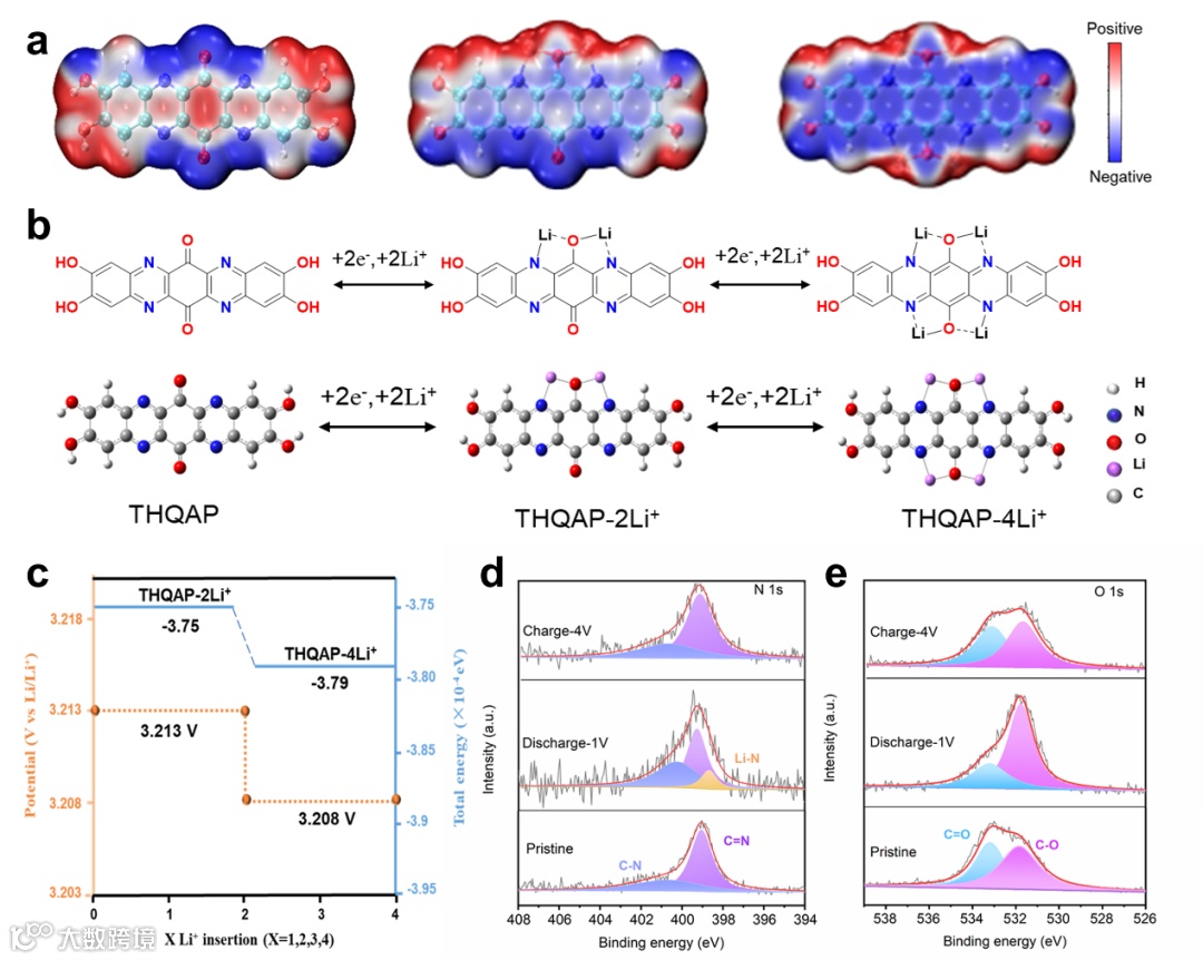 为了研究THQAP的锂离子存储机理,该工作又进行了MESP、THQAP-xLi+的氧化还原电位(包含THQAP-xLi+总能量)相关理论计算分析,并进行了不同充/放电状态下非原位XPS的测试分析(图5)。结果表明THQAP的锂化过程可分为两步,每步可进行两个电子的氧化还原过程,Li+同时与C=O官能团和C=N官能团结合(2个Li+与一侧的羰基氧结合),由于THQAP正极材料可以可逆的嵌入/脱出4个Li+,因此可以表现出较高的实际比容量。