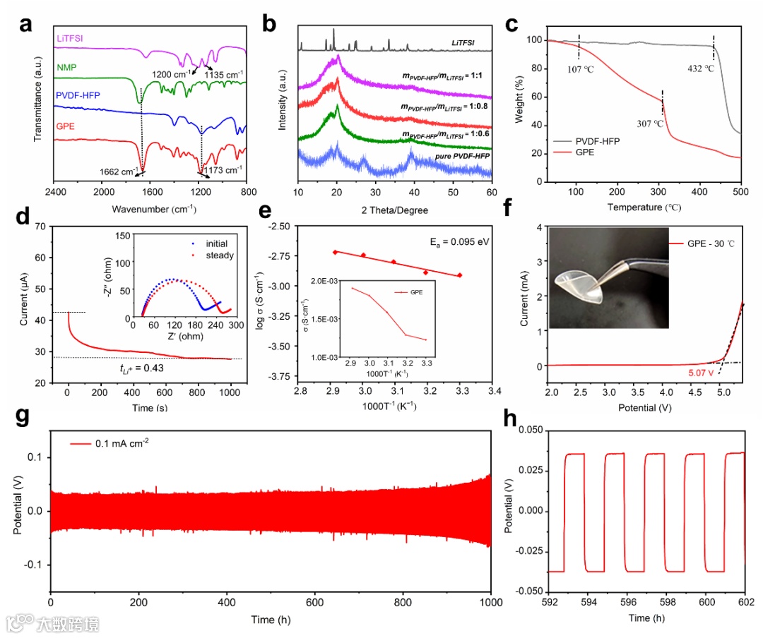 本文将PVDF-HFP和双(三氟甲基磺酰)亚胺锂(LiTFSI)在溶剂NMP中搅拌均匀并采用浇筑法制备了GPE-0.8电解质薄膜。如图2所示,红外光谱、X-射线粉末衍射和热重分析表征了含有LiTFSI的准固态电解质的物理化学特性,证明了GPE-0.8电解质薄膜成分均一且具有较好的热稳定性。