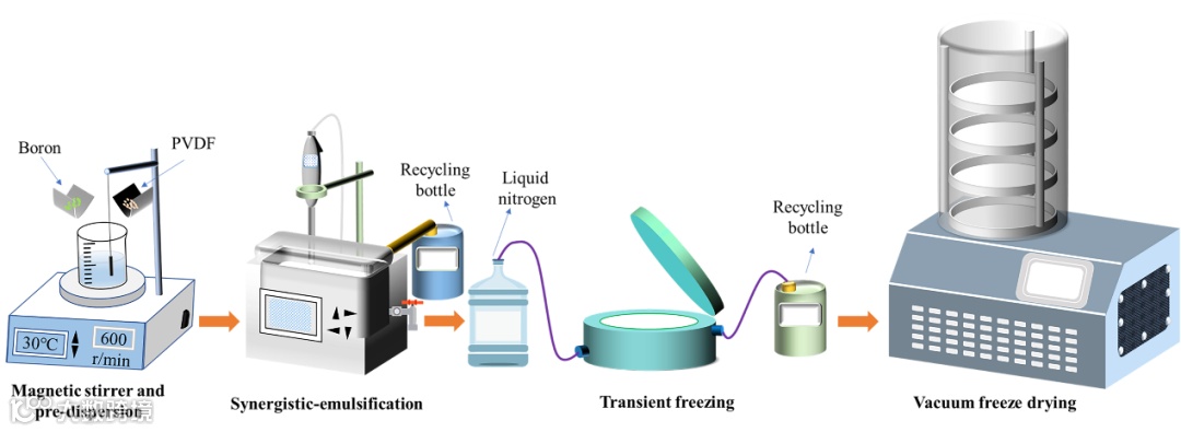 在制备这种具有特殊结构的高反应活性B/PVDF复合镶嵌结构时,该论文提出了协同乳化和瞬态冷冻协同联用的工艺方法,即利用高速剪切乳化装置的剪切力与低幅、高频振动发生器的振动力协同施加于B和PVDF溶液体系,使得B颗粒稳定地悬浮于具有一定浓度和粘度的PVDF溶液中,随即将这种稳定的悬浮体系引入具有特定形状的模具中,并利用液氮进行快速冷冻,之后将冻结的复合样品进行真空冷冻干燥处理以获得B/PVDF复合镶嵌结构产品。