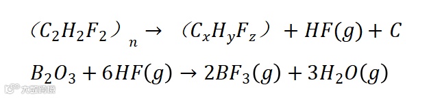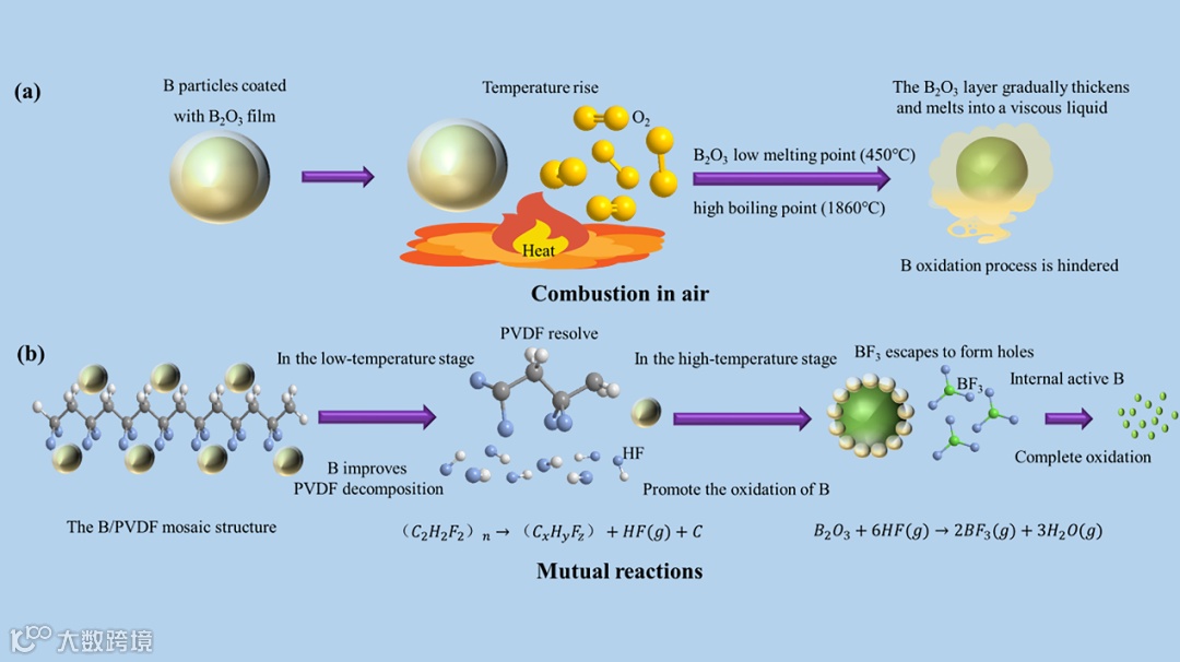 然后,部分HF气体逸出并与B2O3之间发生PIR以产生BF3和H2O,这破坏了B2O3的惰性涂层并暴露了内部的活性B。最后,随着活性B的进一步暴露,HF气体将与B反应形成BF3和H2。此外,部分C与B反应生成B4C3。另外,当在大气环境中反应时,还存在F和O争夺B的竞争反应过程。