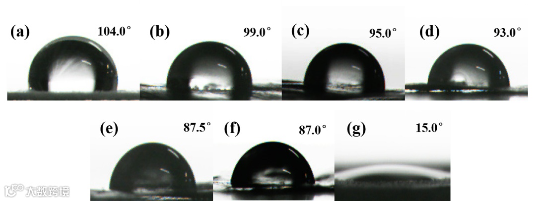 图5 不同样品的静态水接触角:(a) PVDF, (b) B-10, (c) B-30, (d) B-50, (e) B-70, (f) B-90 和 (g) B 粉