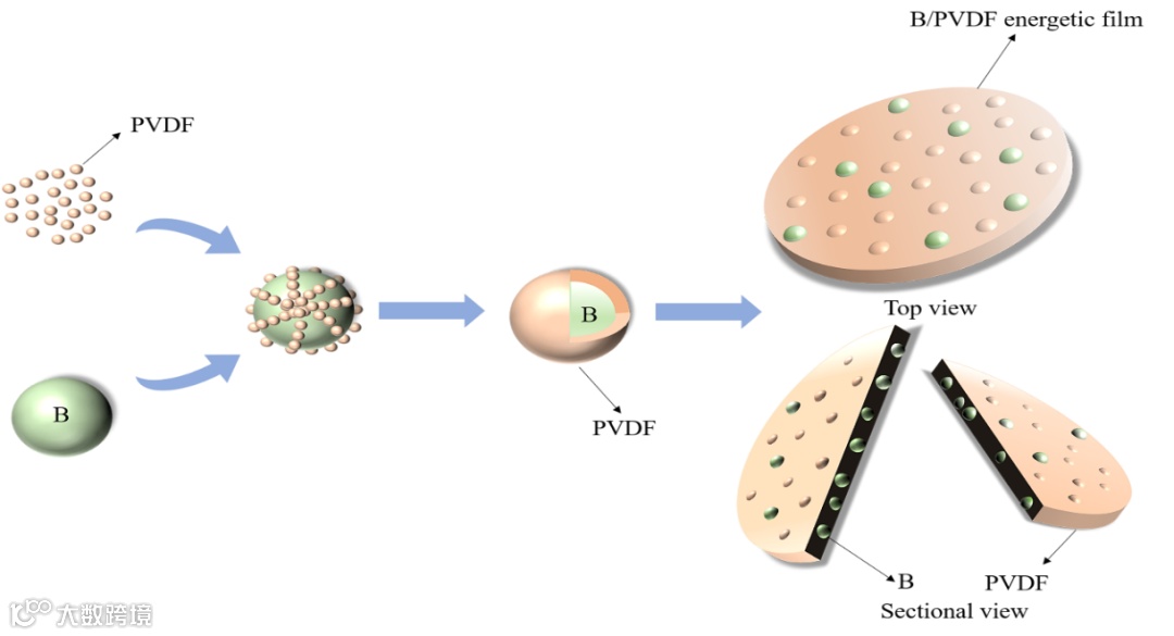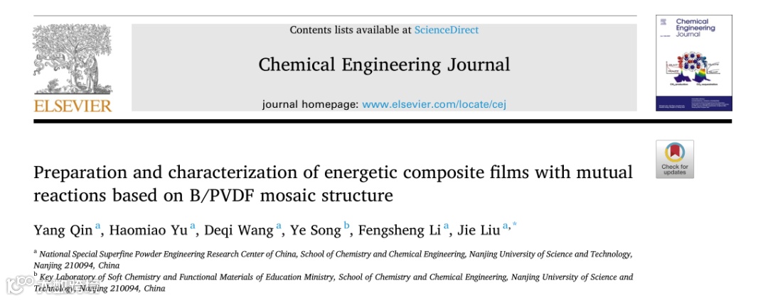 针对上述硼粉实际应用时存在的矛盾和难题,来自南京理工大学李凤生教授团队的刘杰老师,带领课题组在Chemical Engineering Journal(IF:16.744)上发表了题为“Preparation and characterization of energetic composite films with mutual reactions based on B/PVDF mosaic structure”的研究文章。