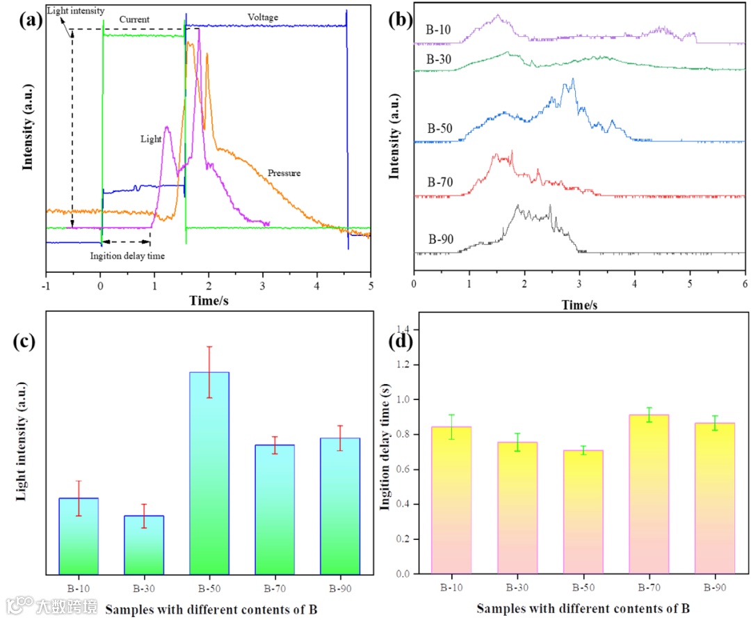 图8 (a)示波器上的典型电压、电流、压力和光信号;(b)不同样品的光信号曲线;(c)不同B含量样品的峰值光强;(d)不同B含量样品的点火延迟时间