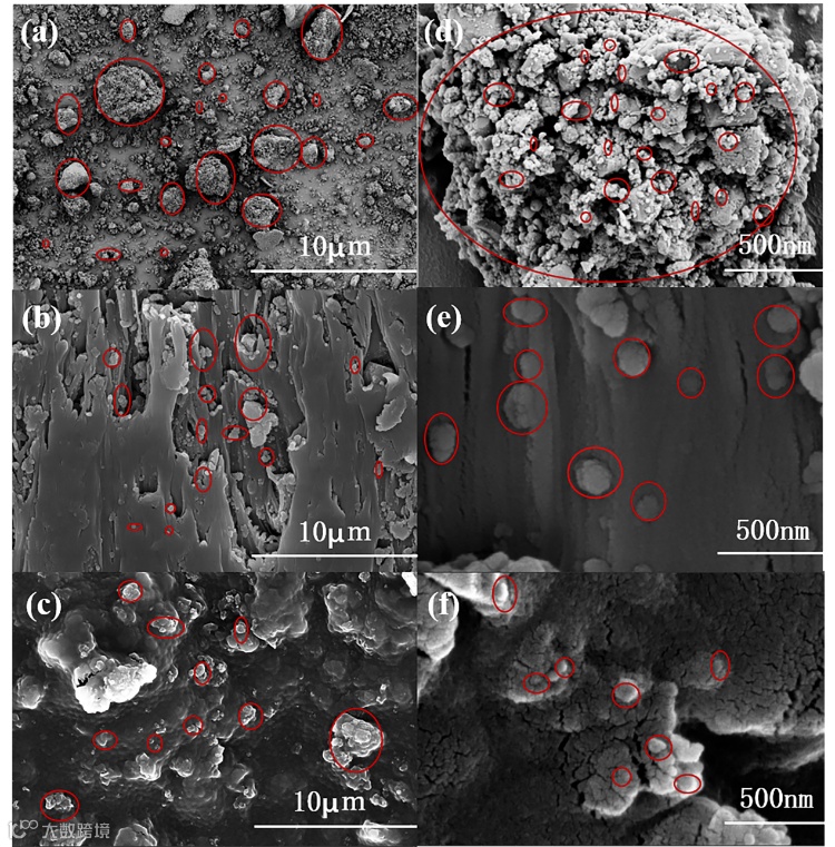 图3 (a, d)为原料B的SEM图像,(b, e)为B-50的截面SEM图像,(c, f)为B-50的表面SEM图像