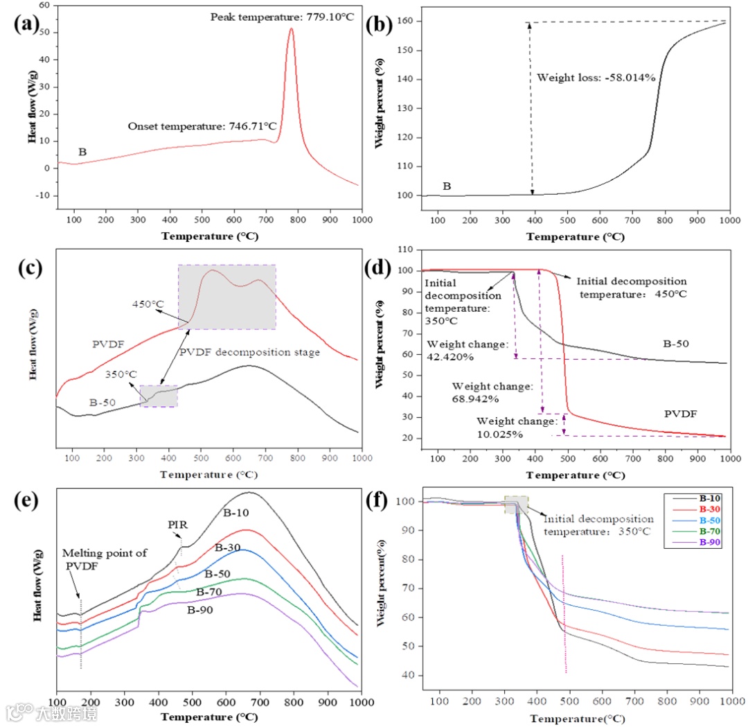 图7 B, PVDF和B/PVDF的热分析: (a, c, e) DSC 和 (b, d, f) TG 曲线