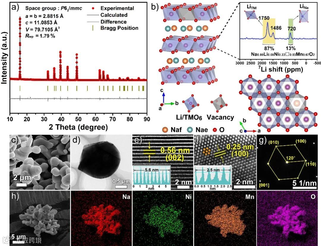 图1:P2-NLNMO正极材料的结构和形貌表征:a)Rietveld精修XRD图谱及相应的晶胞参数;b)P2-NLNMO的晶体结构示意图,插图是P2-NLNMO的7Li ss-NMR图谱;c)SEM图;d)TEM图;e,f)HRTEM图;g)选区电子衍射图;h)SEM-EDS mapping元素分布图。