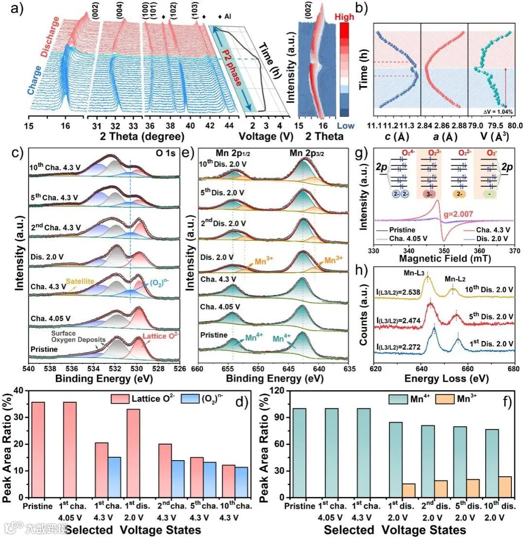 图3:P2-NLNMO正极材料在2.0-4.3 V电压窗口内的储钠机制:a)原位XRD图;b)充放电过程中晶胞参数演变;c)O 1s,e)Mn 2p的XPS谱图;d)O2-和(O2)n-以及f)Mn3+和Mn4+在不同充放电状态下的峰面积比;g)非原位EPR图和h)非原位EELS图。