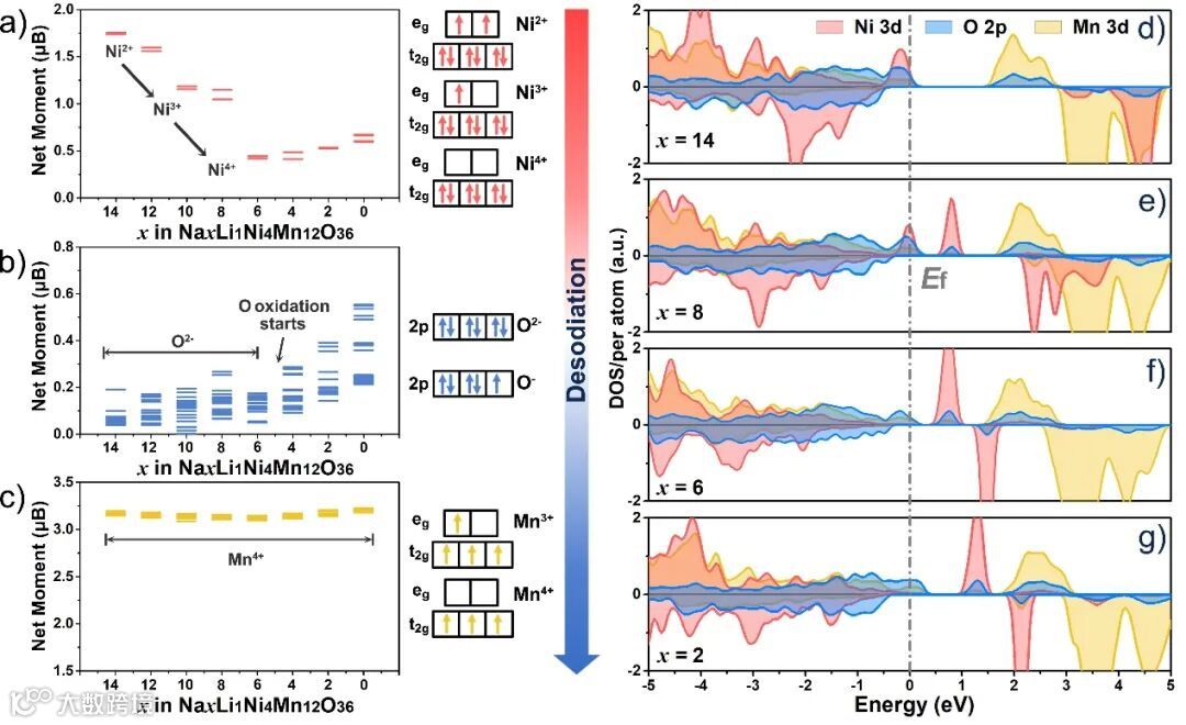 图5:DFT计算:a-c)NaxLi1Ni4□1Mn12O36的磁化强度演变图(x = 14,12,10,8,6,4,2,0);d-g)NaxLi1Ni4□1Mn12O36的PDOS图。