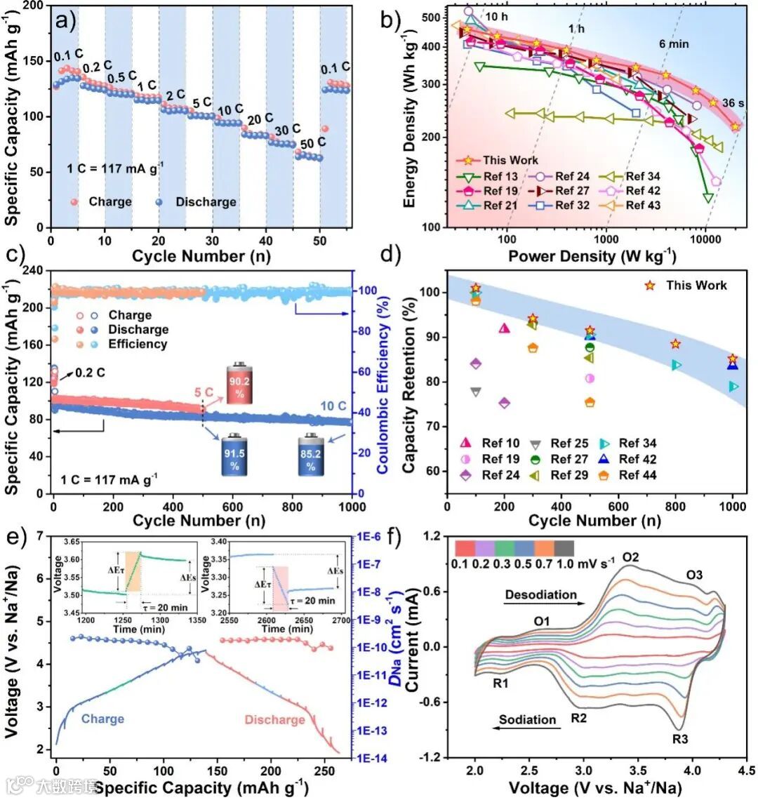 图4:P2-NLNMO正极材料的电化学性能和电极过程动力学:a)倍率性能;b)与之前报道的Ni-Mn基层状氧化物材料的能量密度和功率密度对比;c)5 C和10 C下的长循环性能;d)与之前报道的Ni-Mn基层状氧化物材料的长循环性能对比;e)GITT图及对应的钠离子扩散系数(DNa);f)不同扫速下的CV曲线。