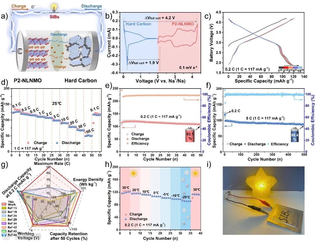 图6:P2-NLNMO正极和硬碳负极组装的钠离子全电池的电化学性能:a)全电池示意图;b)P2-NLNMO正极和硬碳负极的CV曲线;c)0.2 C电流密度下的全电池充放电曲线;d)倍率性能;e)0.2 C电流密度下的短循环性能;f)5 C电流密度下的长循环性能;g)全电池性能对比雷达图;h)低温电化学性能;i)软包全电池点亮LED灯的照片。