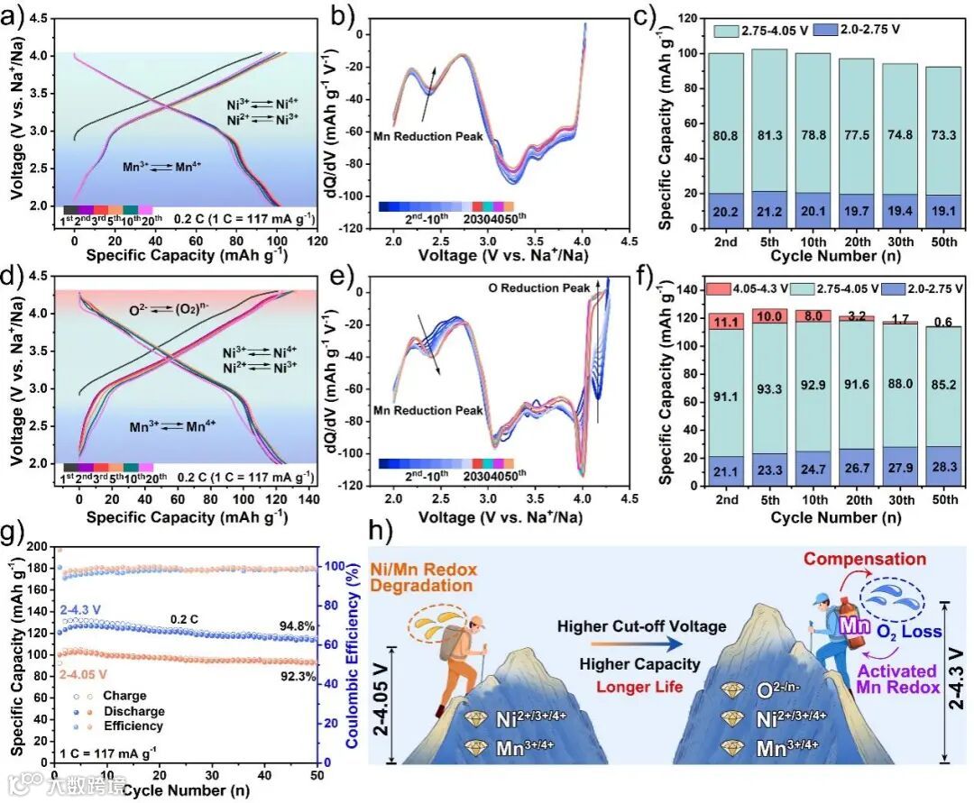 这是由于当将充电截止电压提高到4.3 V时,激发了阴离子氧化还原反应,同时,部分不可逆的氧气释放降低了完全放电状态下Mn的平均价态以维持电荷平衡。因此,更多的Mn3+/Mn4+氧化还原电对在后续循环中被激活,有效地补偿了氧损失造成的容量衰减,从而维持了电池优异的循环稳定性。