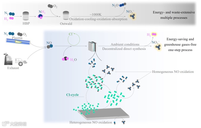 该工作不仅展示了一种绿色高效的硝酸盐合成途径(比电化学N2氧化以及电化学NO氧化产硝酸盐效率更高),而且揭示了氯循环在结合氮循环上的巨大潜力。将涉及难/不溶性气体(如NO)的电催化反应推向电极表面以外的均相溶液环境。