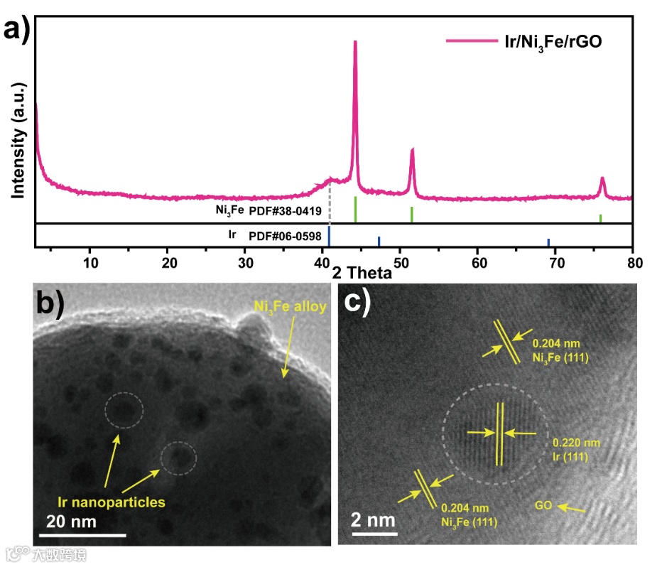 图2 Ir/Ni3Fe/rGO的(a)XRD 图,(b)TEM 和(c)HRTEM 图