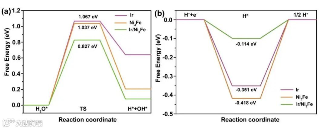 图9(a)H2O分解反应的能垒,(b)H*的吉布斯自由能