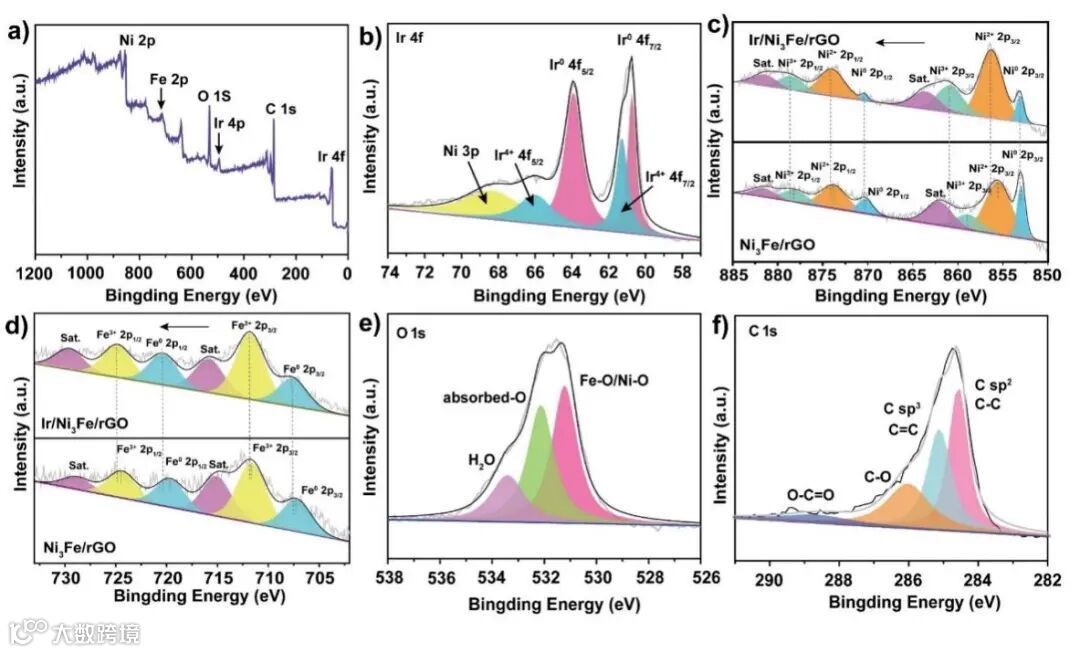 图3 Ir/Ni3Fe/rGO的XPS图:(a)总谱图,(b)Ir 4f谱图,(c)Ir/Ni3Fe/rGO 和Ni3Fe/rGO中Ni 2p谱图,(d)Ir/Ni3Fe/rGO 和Ni3Fe/rGO中Fe 2p谱图,(e) O 1s 和 (f) C 1s谱图